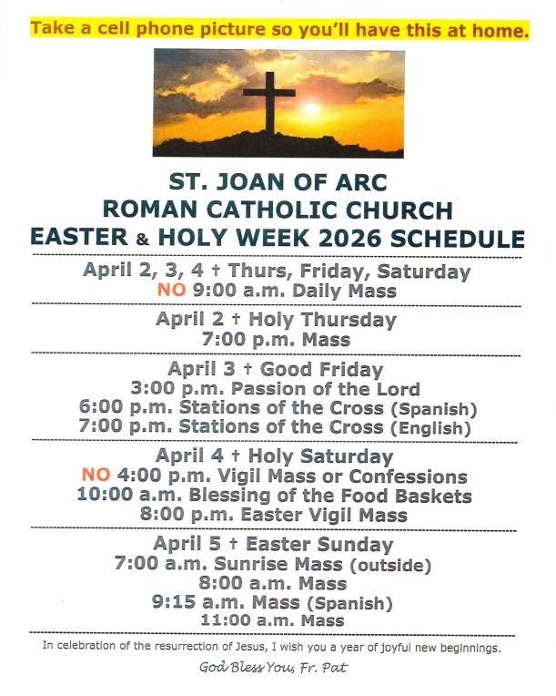 At St. Joan of Arc, our parish bulletins are your go-to source for the latest news, events, and inspiration. Each week, we share important updates, spiritual reflections, and opportunities to connect with our vibrant community. Stay informed and engaged with us!